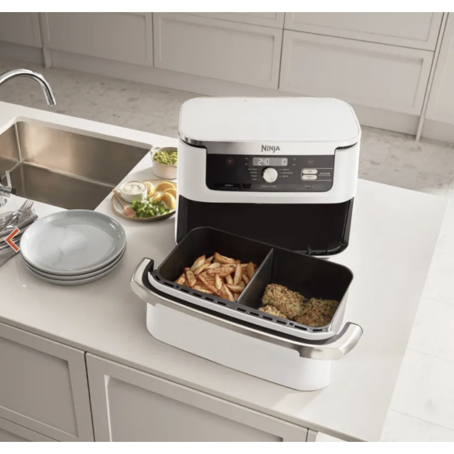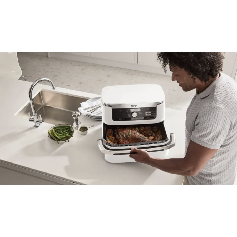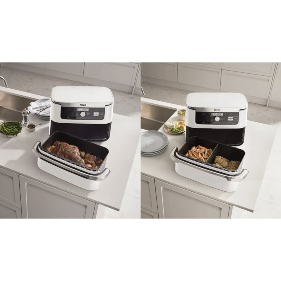Мультипіч Ninja Foodi FlexDrawer 10,4 л AF500EUWH пропонує абсолютно новий рівень зручності в приготуванні завдяки технології MegaZone. Знімна перегородка з антипригарним покриттям дозволяє створювати дві окремі зони приготування, кожна з яких має свої налаштування температури та часу. Поки в першій зоні ви готуєте хрустку картоплю фрі, а в другій — соковиті стейки або навіть рибу. Коли виникає потреба приготувати велику страву, таку як качка з яблуками або вишневий пиріг, перегородка легко знімається та перетворює два кошики на один великий. Мультипіч Ninja — це універсальний інструмент для кулінарних експериментів!