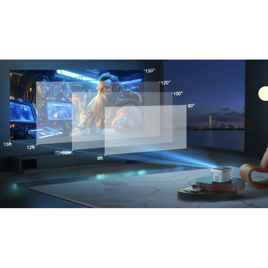 Проектор Yaber U11 здатен самостійно налаштовувати фокус і вирівнювати зображення, тож вам не потрібно витрачати час на ручні коригування. Вбудована камера з високоточною лінзою миттєво аналізує відстань та змінює параметри проекції, щоб кожен кадр виглядав чітко. Система автоматично виправляє трапецієподібні спотворення та створює ідеально пропорційне зображення, яким би не було розташування проектора чи кут нахилу. Ви можете обрати оптимальну діагональ від 80″ до 150″ та підлаштувати розмір картинки під будь-який простір. Домашній кінозал з екраном 150 дюймів чи компактний перегляд на 80″ — Yaber U11 адаптується до ваших потреб, щоб ви фокусувалися лише на сюжеті та враженнях від перегляду.