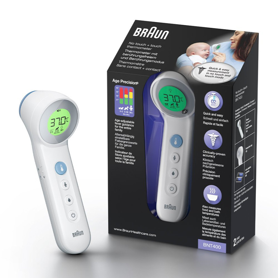 Braun BNT400 обладает запатентованной технологией Age Precision, устраняющей погрешность измерения температуры в зависимости от возраста ребенка или взрослого. Также можно определить температуру контактным и бесконтактным способом. Термометр имеет специальный режим, позволяющий измерять температуру пищи, напитков или даже ванны для вашего малыша.
