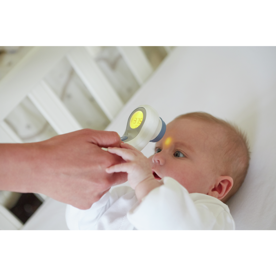 Вы можете получить быстрые и точные измерения температуры, прикоснувшись девайсом ко лбу между бровями. Или же определяйте температуру бесконтактно, чтобы не будить малыша, держа термометр на расстоянии до 2 см от середины лба, направив его между бровями.