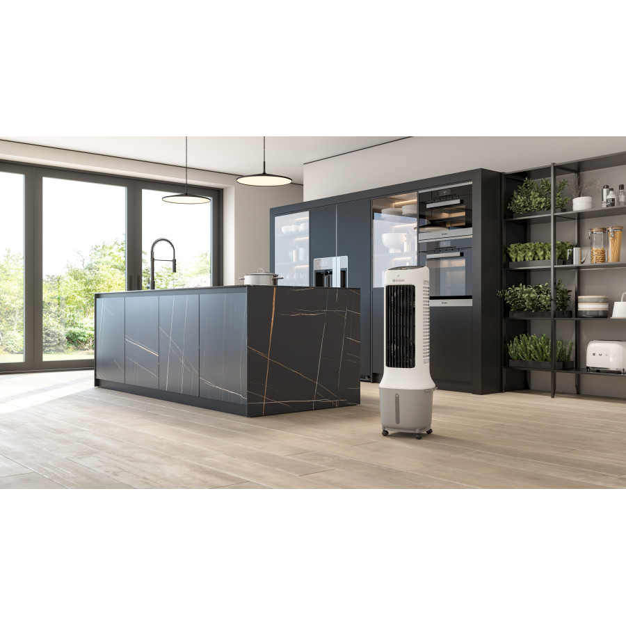 Охладитель воздуха Olimpia Splendid PELER TOWER 10 — это ответ на ежедневное «мне жарко» в условиях городской квартиры, летней кухни или домашнего кабинета. Модель становится практичным решением с широкими возможностями. Вместо того чтобы просто дуть холодом в одну точку, PELER TOWER 10 обеспечивает глубокое рассеивание воздуха до 12 м, чтобы охватить всю комнату или даже студию. Пока вы работаете за ноутбуком, устройство создает приятную, равномерную прохладу, которая не сушит воздух и не создает сквозняков. Никакого шума, только легкий шелест до 63 дБ, чтобы читать, работать или засыпать без раздражения. Резервуар на 10 л позволяет забыть о доливании воды каждый день, а контейнер для льда усиливает охлаждение в жаркие дни. Управление с пульта или сенсорного дисплея поможет изменить настройки, активировать таймер или выключить устройство.