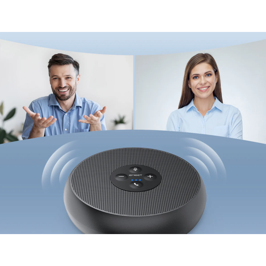 Портативный спикерфон eMeet оснащен двумя встроенными микрофонами с искусственным интеллектом, чтобы выделять и улавливать голос в любой части вашего рабочего пространства. Это обеспечивает высокое качество звука и делает удаленные встречи похожими на разговор с глазу на глаз. Благодаря функции автоматического усиления голоса спикерфон определяет расстояние до звука и автоматически регулирует громкость, обеспечивая плавное гармоническое общение. eMeet оснащен полнодуплексной технологией и функцией устранения эха.