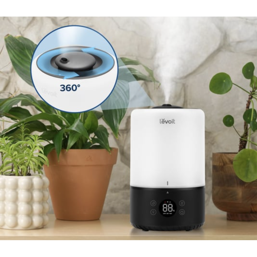 Бесплатное приложение VeSync поможет устанавливать таймеры, управлять настройками, создавать расписания с желаемыми режимами и скоростями, проверять влажность и многое другое, где бы вы ни были. А голосовое управление с ассистентами Amazon Alexa и Google Assistant особенно понадобится, пока вы будете развлекаться с семьей, друзьями или домашним питомцем. Выбирайте направление распыления на 360 градусов с соплом.