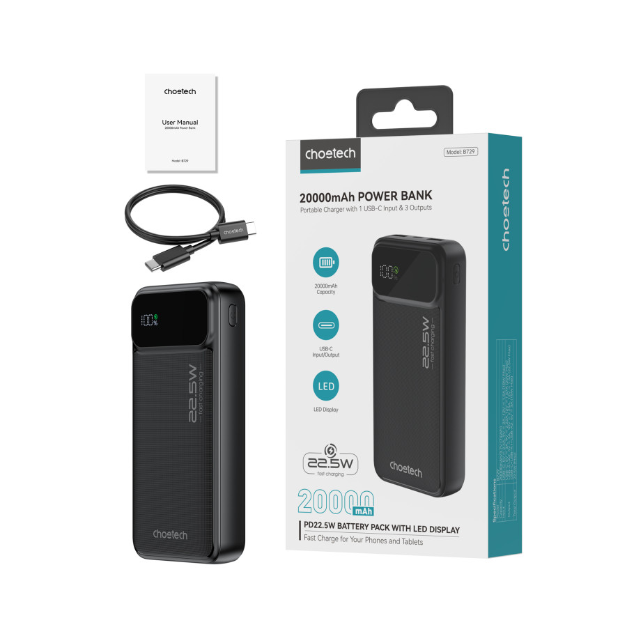 Choetech B729 вражає не лише своєю потужністю, але й продуманим дизайном для максимальної мобільності. Попри значну ємність, павербанк має компактні розміри та вагу всього 450 г, щоб супроводжувати вас комфортом у подорожах. Він легко вміщується в кишені, невеликій сумці чи рюкзаку й не обтяжує додатковою вагою. Елегантний чорний корпус з матовим покриттям стійкий до відбитків пальців для створення естетичного вигляду аксесуара. У комплекті ви отримаєте компактний кабель USB-C, який забезпечує швидку зарядку як самого павербанка, так і ваших пристроїв. Купуйте Choetech B729, щоб отримати функціональність та зручність у кожній деталі.