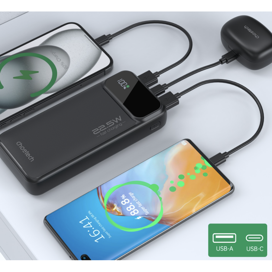 Павербанк Choetech B729 вирізняється своєю універсальністю завдяки продуманому набору портів. Два виходи USB-A забезпечують стандартне з'єднання для більшості сучасних гаджетів. Порт USB-C підтримує швидку зарядку потужністю до 22,5 Вт для сумісних пристроїв, таких як нові моделі смартфонів, ноутбуки та планшети. Ця комбінація дозволяє одночасно заряджати до трьох одиниць електроніки й ефективно розподіляти потужність між ними. USB-C порт також працює як вхід для швидкого заряджання павербанка, що значно скорочує час його підготовки до роботи. Ця гнучкість особливо корисна в подорожах або робочих поїздках, коли важливо мати один компактний пристрій для заряджання всієї техніки.