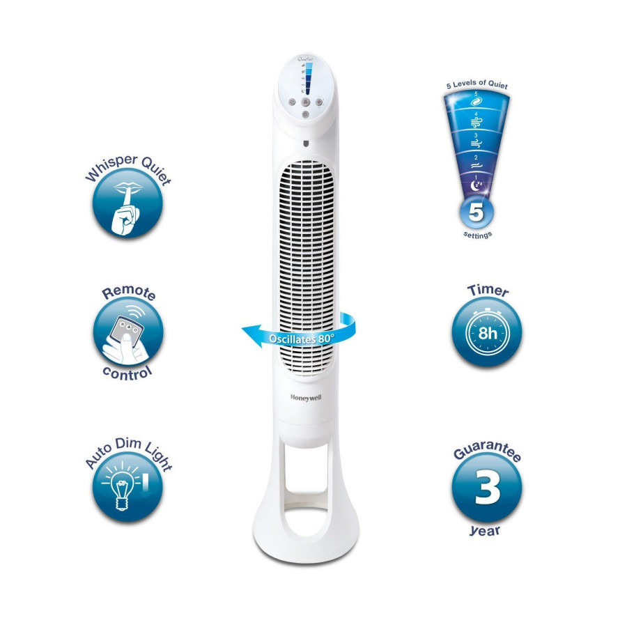 Вентилятор-колона Honeywell створений для тих, хто цінує комфорт і сучасні технології. Цей стильний пристрій з 5 режимами швидкості дозволяє точно налаштувати рівень охолодження та шуму під ваші потреби. З його пультом дистанційного керування ви можете безконтактно змінювати налаштування, а функція обертання на 80° забезпечує рівномірний розподіл прохолодного повітря по всій кімнаті. Таймер на 1-8 годин і автоматичне затемнення дисплея додають зручності та враховують індивідуальні потреби кожного користувача, а міцна основа з ручкою для перенесення сприяють мобільності. Тиха робота гарантує вам комфорт навіть у спальнях, щоб ваш сон був якісним з ідеальною температурою навколо. Honeywell QuietSet Whole Room не лише охолоджує повітря, але й створює комфортну атмосферу та покращує циркуляцію повітря.