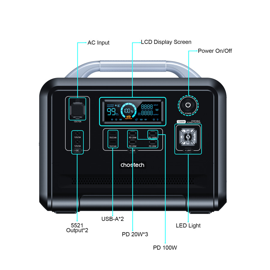 Незалежно від того, піднімаєтеся ви на гору, вирушаєте в подорож на автофургоні або відпочиваєте на відкритому повітрі, електростанція CHOETECH потужністю 1200 Вт/год забезпечить живлення ваших електронних пристроїв. Оснащений входом змінного струму, двома портами USB-A, трьома портами PD 20 Вт, портом PD100 Вт, двома виходами постійного струму, РК-дисплеєм і сигналом SOS.